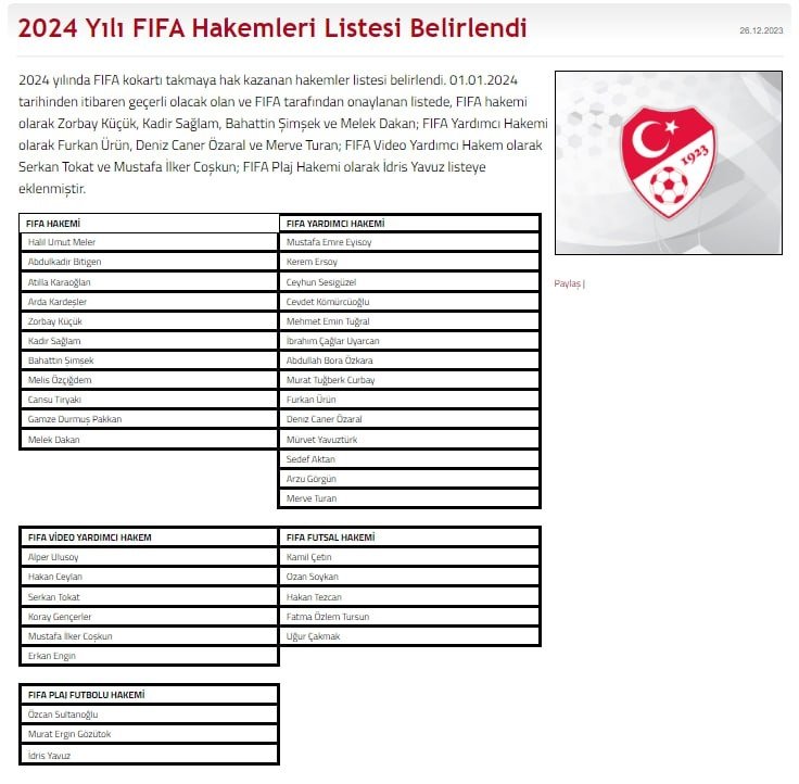 “2024 yılında FIFA kokartı takmaya hak kazanan hakemler listesi belirlendi. 01.01.2024 tarihinden itibaren geçerli olacak olan ve FIFA tarafından onaylanan listede, FIFA hakemi olarak Zorbay Küçük, Kadir Sağlam, Bahattin Şimşek ve Melek Dakan; FIFA Yardımcı Hakemi olarak Furkan Ürün, Deniz Caner Özaral ve Merve Turan; FIFA Video Yardımcı Hakem olarak Serkan Tokat ve Mustafa İlker Coşkun; FIFA Plaj Hakemi olarak İdris Yavuz listeye eklenmiştir.”
