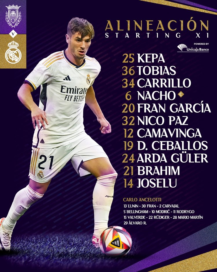 Real Madrid 11: Kepa, Tobias, Carrillo, Nacho, Garcia, Nino Paz, Camavinga, Ceballos, Arda Güler, Brahim, Joselu