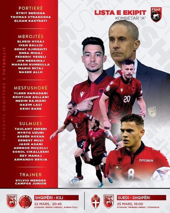 Arnavutluk Milli Takımı’nın, Şili ve İsveç ile oynayacağı hazırlık maçlarının aday kadrosu açıklandı.