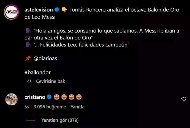 Ödül töreni sonrası Cristiano Ronaldo, Messi hakkındaki eleştirel bir paylaşım altına yaptığı yorumla dikkat çekti.