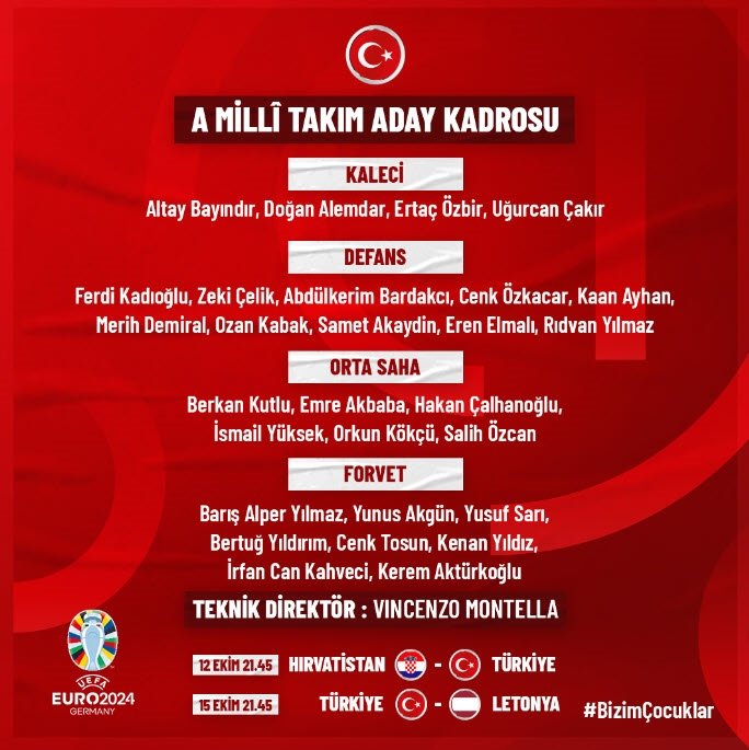 A Milli Futbol Takımı’nın Hırvatistan ve Letonya ile yapacağı maçların aday kadrosunda şu futbolcular bulunuyor: