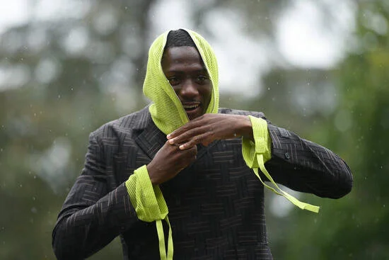 Yüzünü gizlemek için fermuarlı yeşil kapüşonlu bir kıyafet giyen Konate, arabasından indiğinde tüm dikkatleri üzerine çekti.