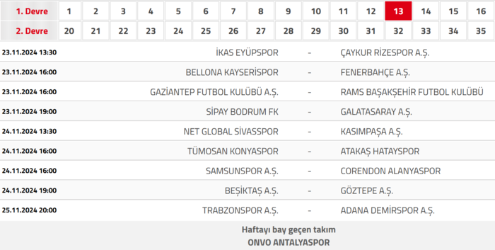 Süper Lig’de ise 13. hafta 23 Kasım’da Kayserispor – Fenerbahçe ve Bodrum FK – Galatasaray karşılaşmasıyla başlayacak.