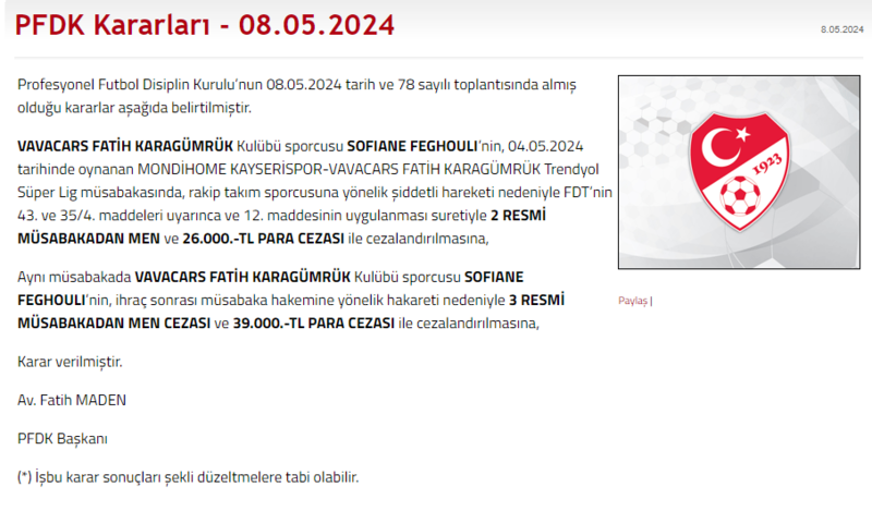 Profesyonel Futbol Disiplin Kurulu (PFDK) Vavacars Fatih Karagümrük forması giyen Sofiane Feghouli’ye,Trendyol Süper Lig’in 35. haftasında oynanan Mondihome Kayserispor maçında yaptığı hareketler sebebiyle 5 maç men cezası verdi.
