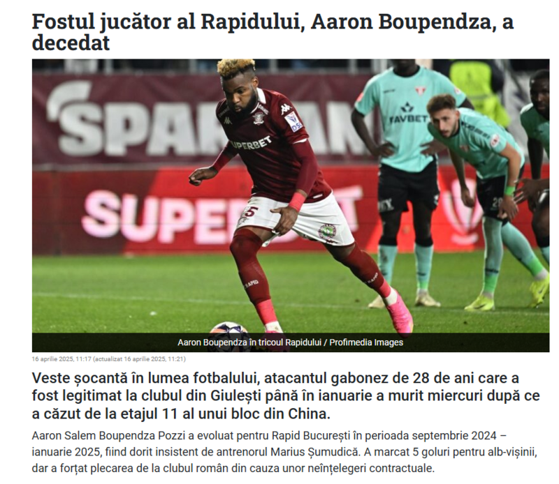 Bir dönem Türkiye’de Hatayspor forması giyen ve gösterdiği performansla ismi büyük kulüplerle anılan Aaron Boupendza için ilk olarak Romanya basınından hayatını kaybettiğine dair haberler yayıldı. Daha sonra futbol dünyasından önemli isimler de bu acı haberi sosyal medya hesaplarında paylaştı. Rapid Bükreş Teknik Direktörü Marius Sumudica’nın oğlu da yaptığı Boupendza paylaşımıyla yaşadığı üzüntüyü dile getirdi.