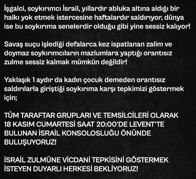 çArşı, Genç Fenerbahçeliler, ultrAslan ve Gurbetçi Gençler taraftar grupları ortak bir açıklama yaparak herkesi 18 Kasım Cumartesi günü saat 20.00’de Levent’te bulunan İsrail Konsolosluğu önüne davet etti.